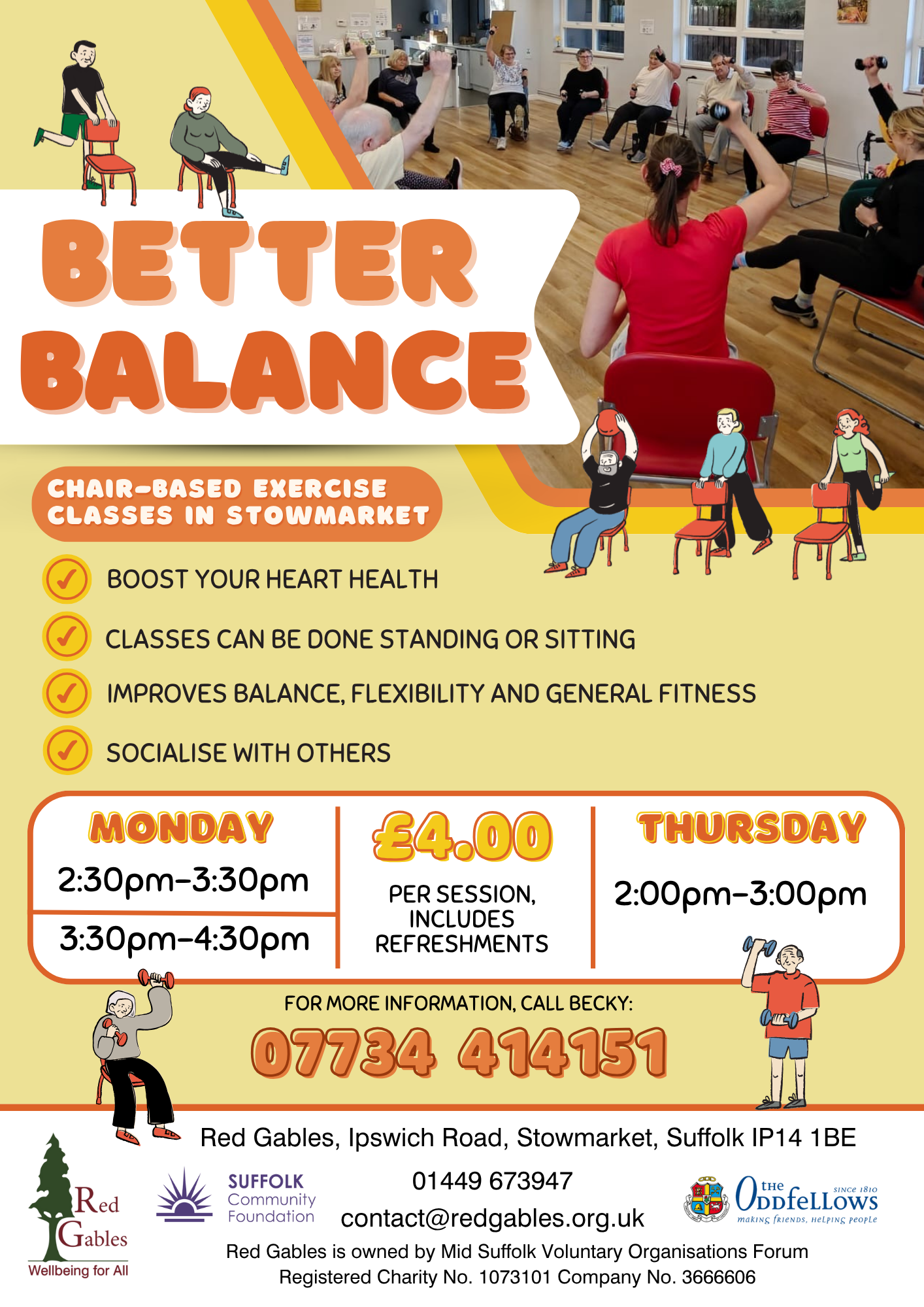 Better Balance currently runs at Red Gables on a Monday from 2:30pm – 3:30pm and a Thursday from 2pm – 3pm. It involves chair-based exercises that focus on building core strength and improving stamina. The sessions are led by qualified instructor Becky and have been proven to reduce medical stresses such as high cholesterol and high blood pressure.