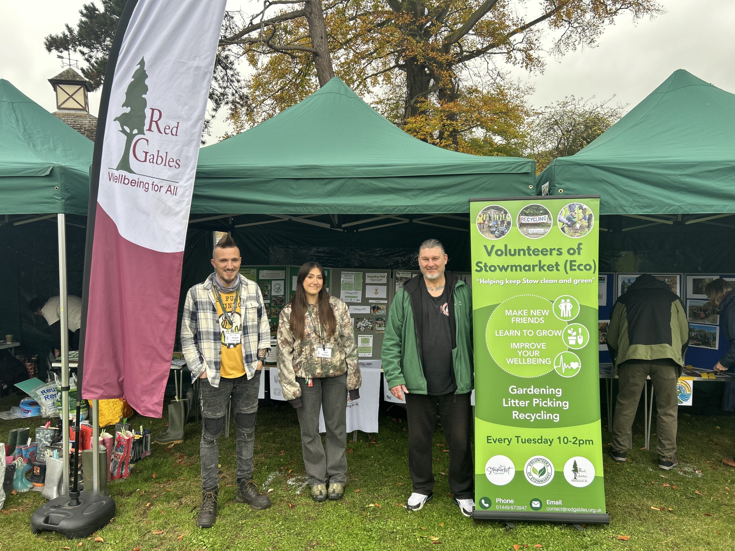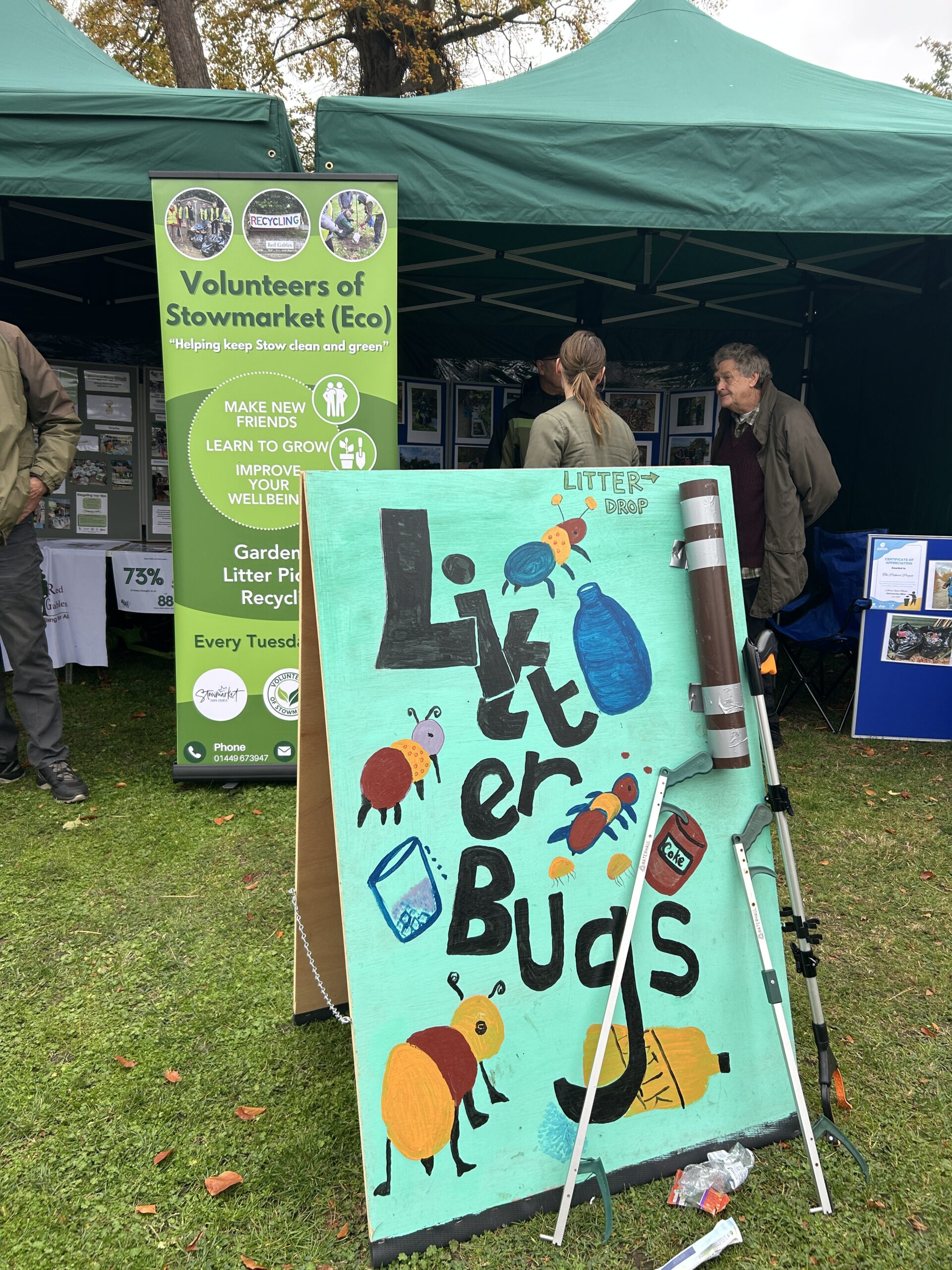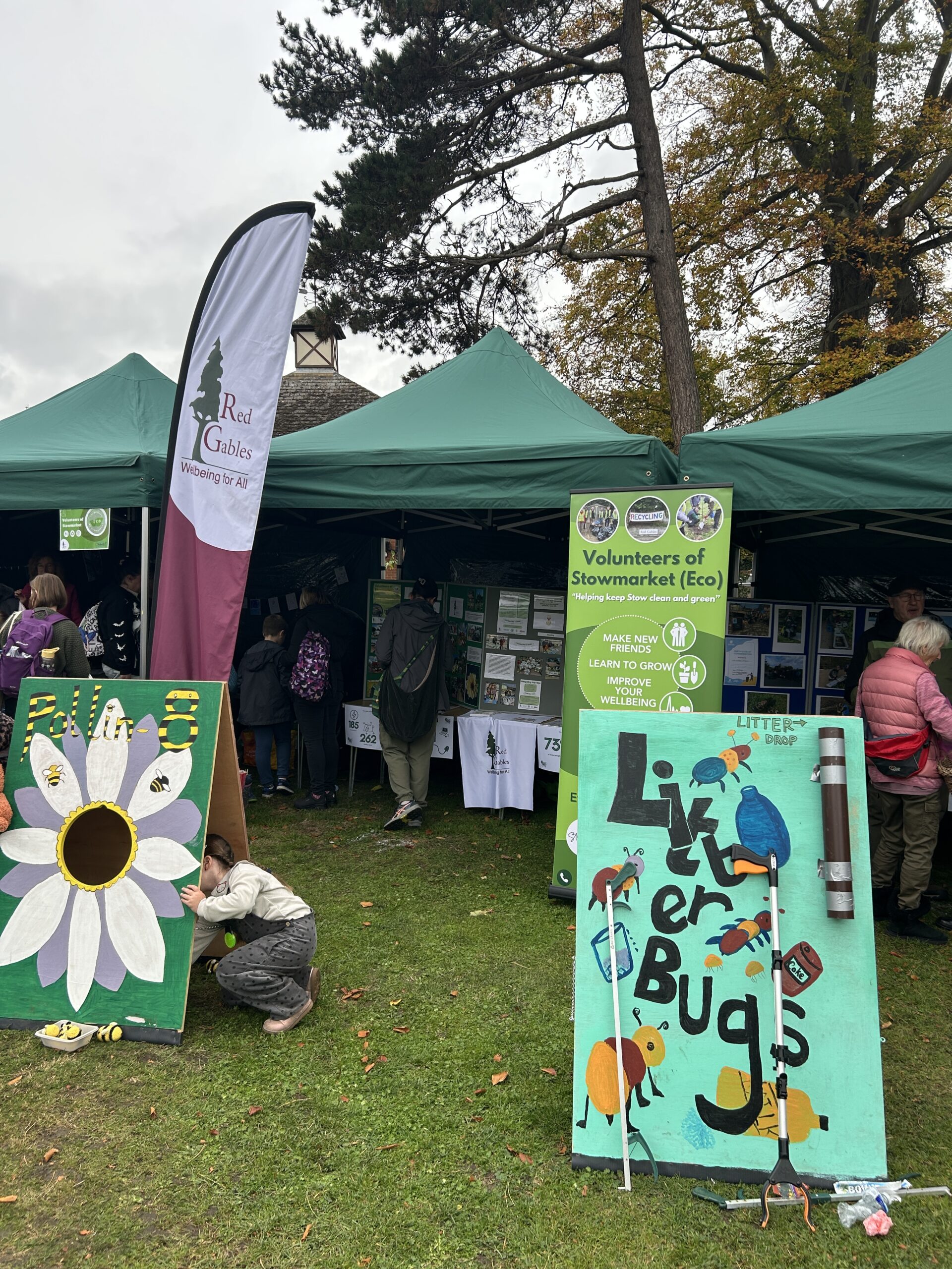 In October 2023, our Volunteers of Stowmarket team got involved by running the refreshments cafe with cakes kindly donated by the 1936 Regal Café, which included delicious vegan and gluten free options. Then in October 2025 we ran an outdoor stall, whilst discussing what goes on at Red Gables and presenting our two wooden frame games ‘Litter bug’ which teaches all ages how to use a litter pick and the ‘Pollin-8’ game. Our neighbouring stalls the Stowmarket Eco Future Group hosted their free welly swap, crafts and a ‘make a pond’ activity, whilst the Pickerel Project provided information on keeping the river Gipping clean and tidy.