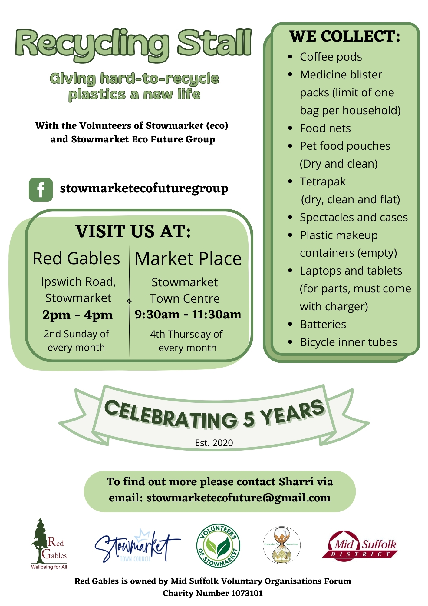 The Recycling Stall is run by Red Gables and Supported by Stowmarket Eco Future Group